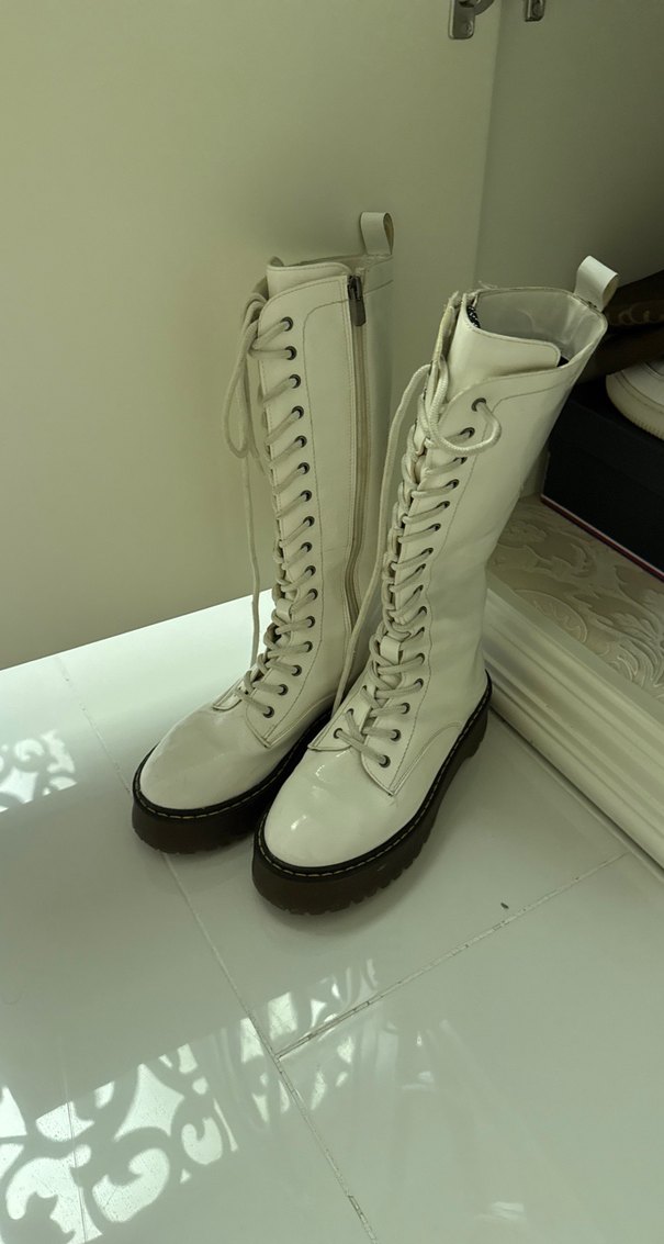 Beyaz, diz boyu bağcıklı çizme, stiletto topuklu ve kemerli tasarıma sahip. Yan fermuarlı, dayanıklı kauçuk malzemeden üretilmiştir.