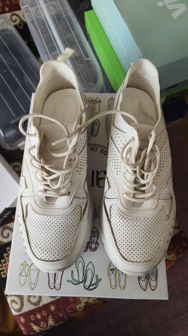 Beyaz bağcıklı, delikli tasarımlı kadın spor ayakkabı. Dolgu topuk ve kauçuk tabanlı, günlük sokak stili için uygun.