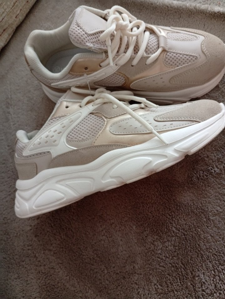 Beyaz bağcıklı kadın spor ayakkabısı, kauçuk malzemeden ve dolgu topuklu. Günlük kullanım ve sokak stiline uygun sade pastel tasarım. sadece bir defa bir saatlik kullanıldı dar geldiği için satiyorum