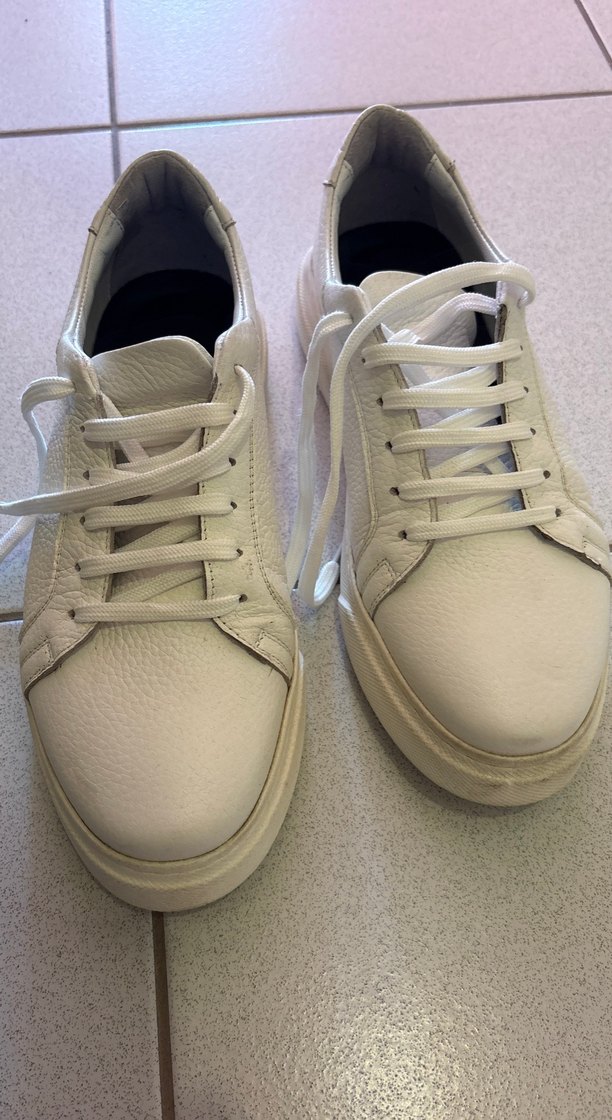 Beyaz renkli, bağcıklı ve ince topuklu kadın sneakers, günlük kullanım için kauçuk malzemeden üretilmiştir.