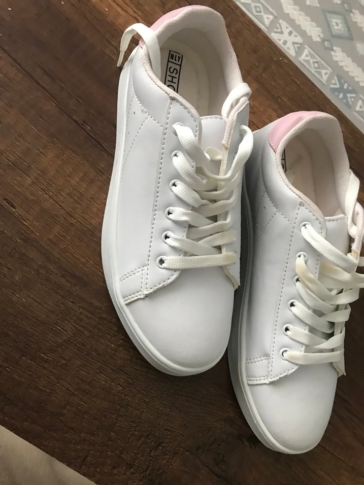 Topuk kısmında pastel pembe detaylı beyaz bağcıklı kadın sneakers, NLY marka spor ayakkabı hediye geldi ayağıma olmadı hiç giyilmedi dururken bağcıklarında çok az yerinde sararma olmuş çıkarıp yıkanınca çıkar 37 numara tam kalıp 36 giyenede olur., günlük kullanıma uygun.