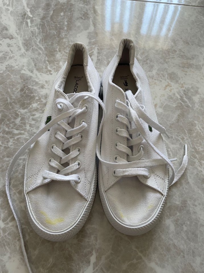 Bağcıklı, düz tabanlı beyaz keten kadın spor ayakkabısı, minimal tasarıma sahip. Günlük rahat sokak stili için uygundur.