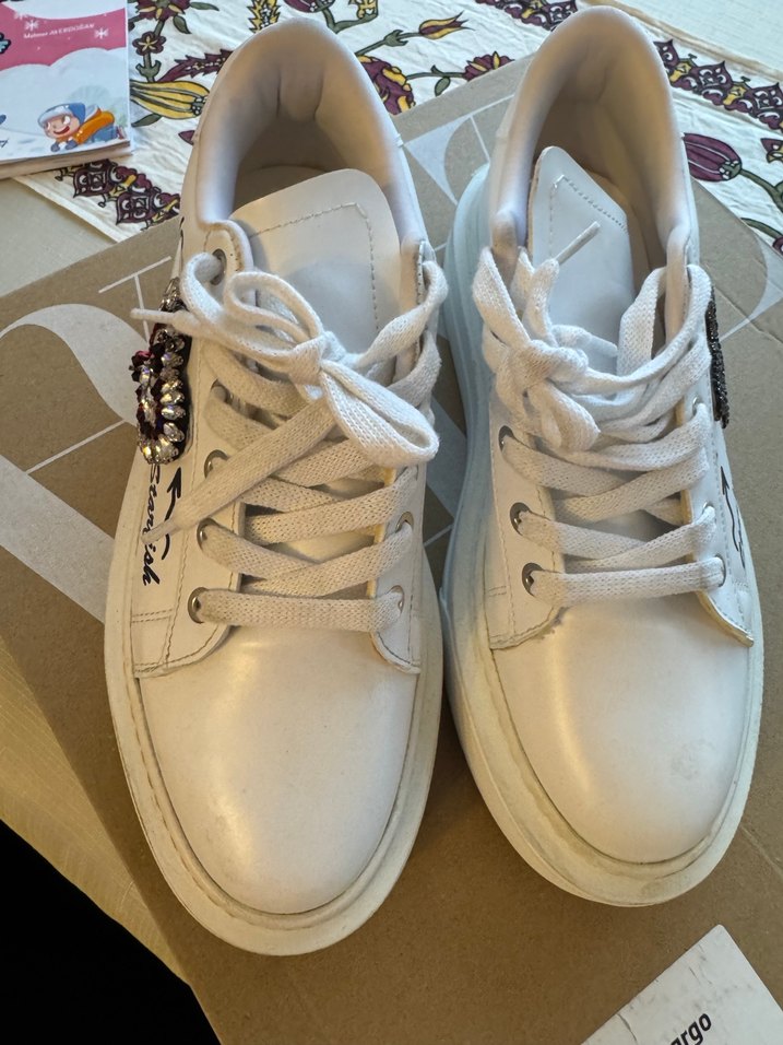 Beyaz bağcıklı kadın spor ayakkabısı, dolgu topuk ve lastik tabanlıdır. Parlak baskılı deseniyle günlük sokak stiline uygundur.