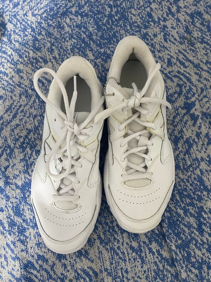 Bağcıklı beyaz kadın spor ayakkabısı, kauçuk tabanlıdır ve spor ile sokak tarzına uygundur. Düz ve desensiz, athleisure konforu sunar.