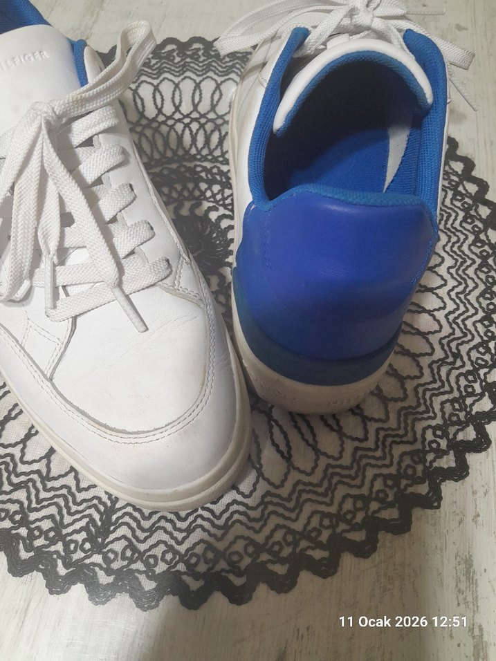 Beyaz bağcıklı kadın spor ayakkabısı, renkli mavi iç detaylı ve dolgu topuklu. Kauçuk tabanlı, spor ve sokak stili için uygun.