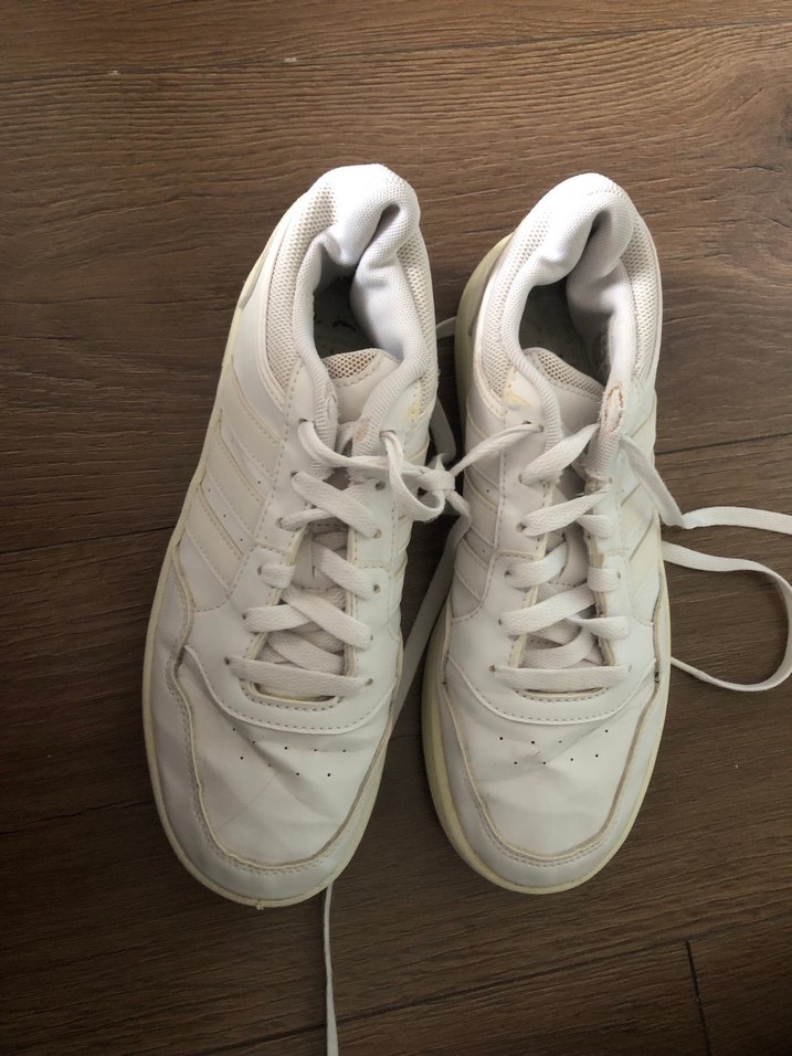 Beyaz, bağcıklı, lastik tabanlı kadın spor ayakkabısı. Düz, desensiz tasarımıyla spor ve sokak stiline uygundur. Altı sararmıştır. Birazcıkta kırılmalar var. Onun dışında bir sorunu yoktur.