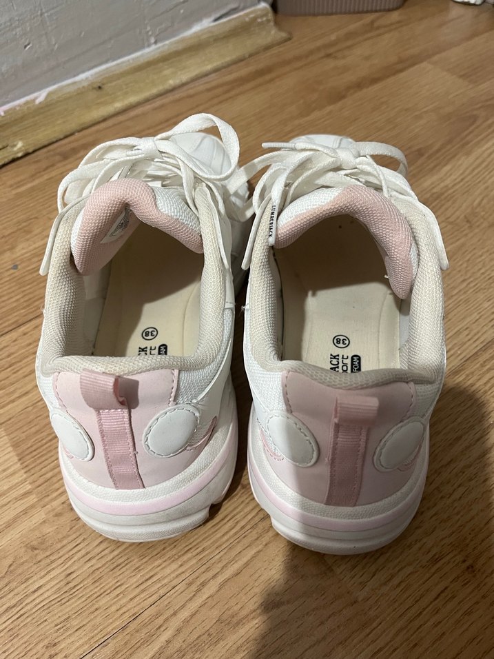 Pastel pembe detaylı, bağcıklı beyaz kadın spor ayakkabısı. Kauçuk tabanlı, sportif ve günlük tarz için uygun. Lumberjack marka 2 3 kere giydim
