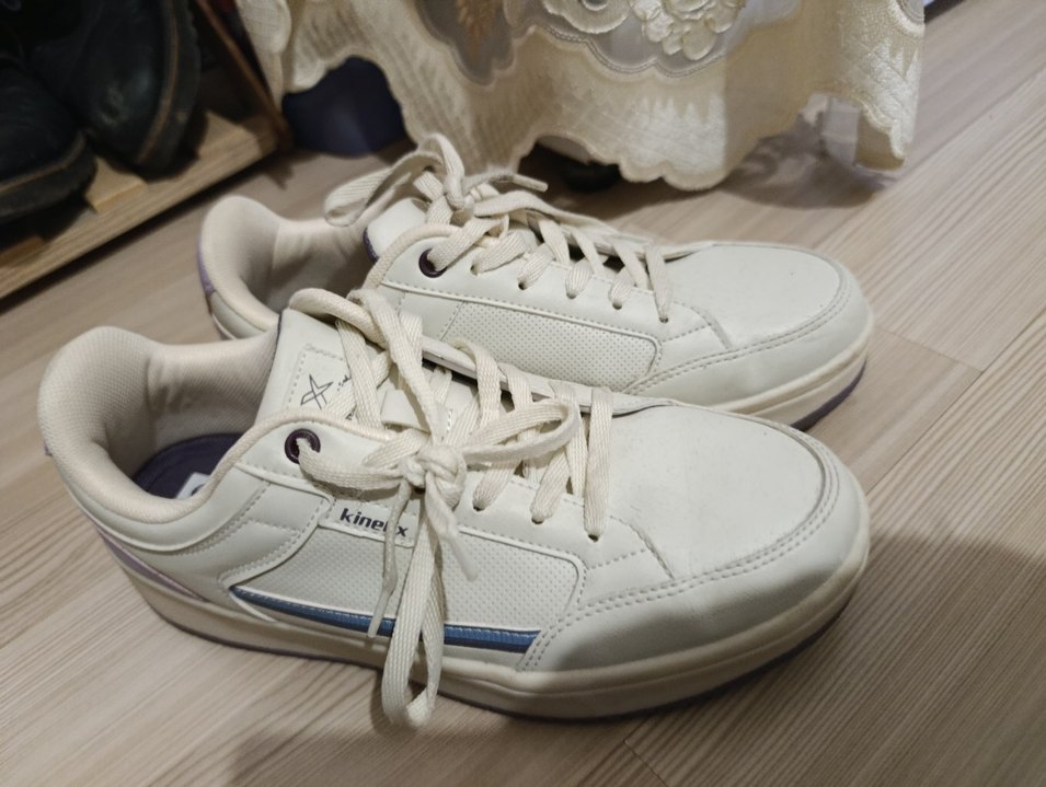 Beyaz bağcıklı kadın spor ayakkabısı, kauçuk tabanlı ve sokak modasına uygun. Hafif ve desensiz tasarıma sahip. sadece bir kere giyildi tertemizdir
