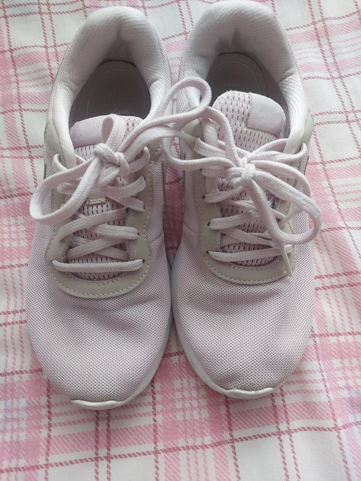 Beyaz bağcıklı kadın spor ayakkabısı, lastik tabanlı ve stiletto topuk stilinde. Spor ve günlük sokak giyimine uygun, sade ve pastel görünümlü.