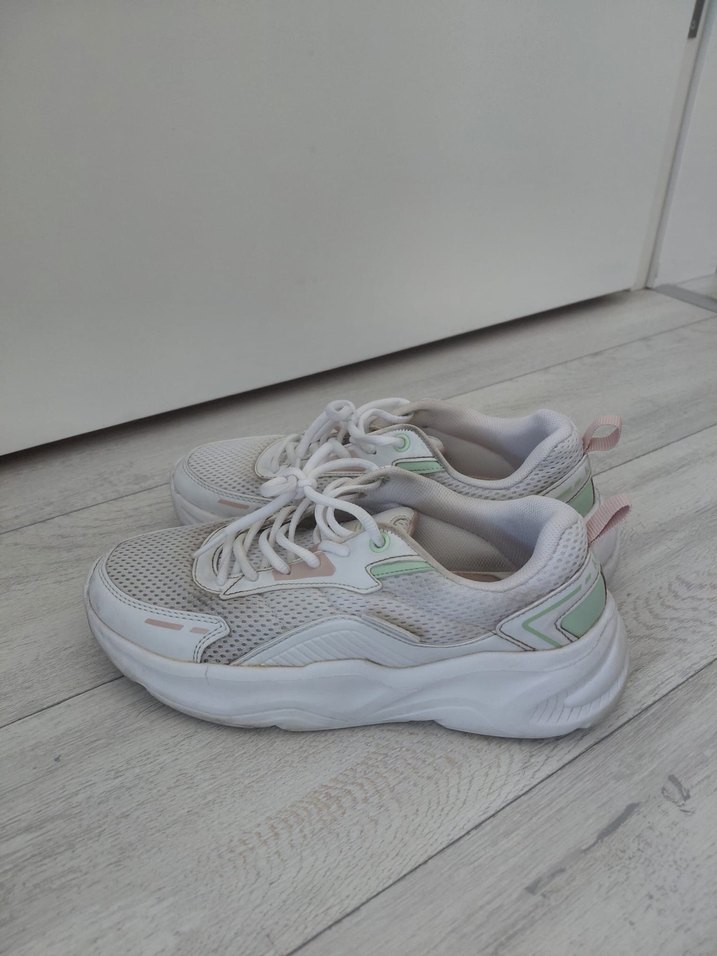 Pastel detaylı, bağcıklı beyaz kadın spor ayakkabısı. Kauçuk tabanlı ve dolgu topuklu, spor ve günlük kullanıma uygun.