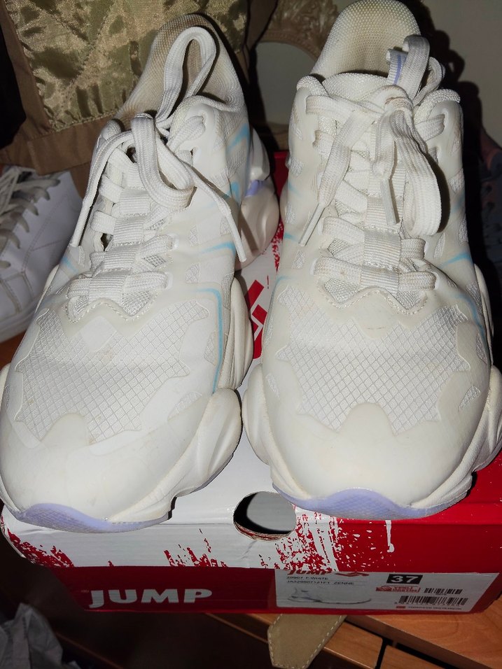 Beyaz, bağcıklı, yüksek tabanlı kauçuk kadın spor ayakkabısı. Spor ve sokak stili için uygun, pastel tonlarda rahat tasarım. jump marka 2 kez giydim