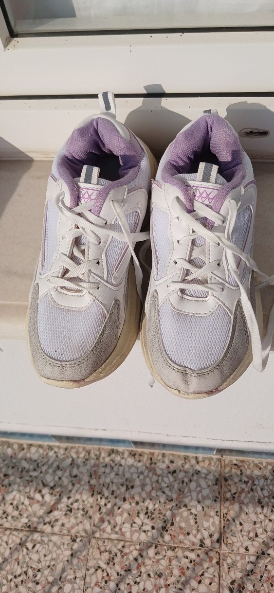 Bağcıklı, beyaz kadın spor ayakkabısı, iç kısmı pastel mor renkli. Kauçuk tabanlı, desensiz ve sade tasarıma sahip, sokak stiline uygun.