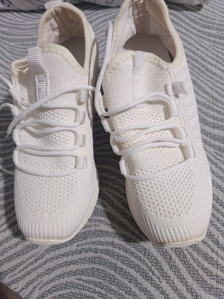 Beyaz bağcıklı, kalın tabanlı kadın spor ayakkabısı. Spor ve günlük kullanıma uygun, kauçuk tabanlı ve sokak modasına uygun tarzda. ♀️