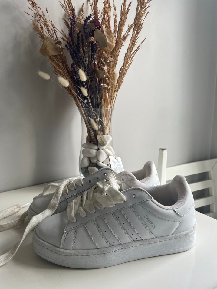 Beyaz bağcıklı kadın spor ayakkabısı, ince topuklu ve desensiz tasarıma sahip. Dayanıklı kauçuk malzemeden üretilmiştir, günlük kullanıma uygun, trend ve bohem tarzda.