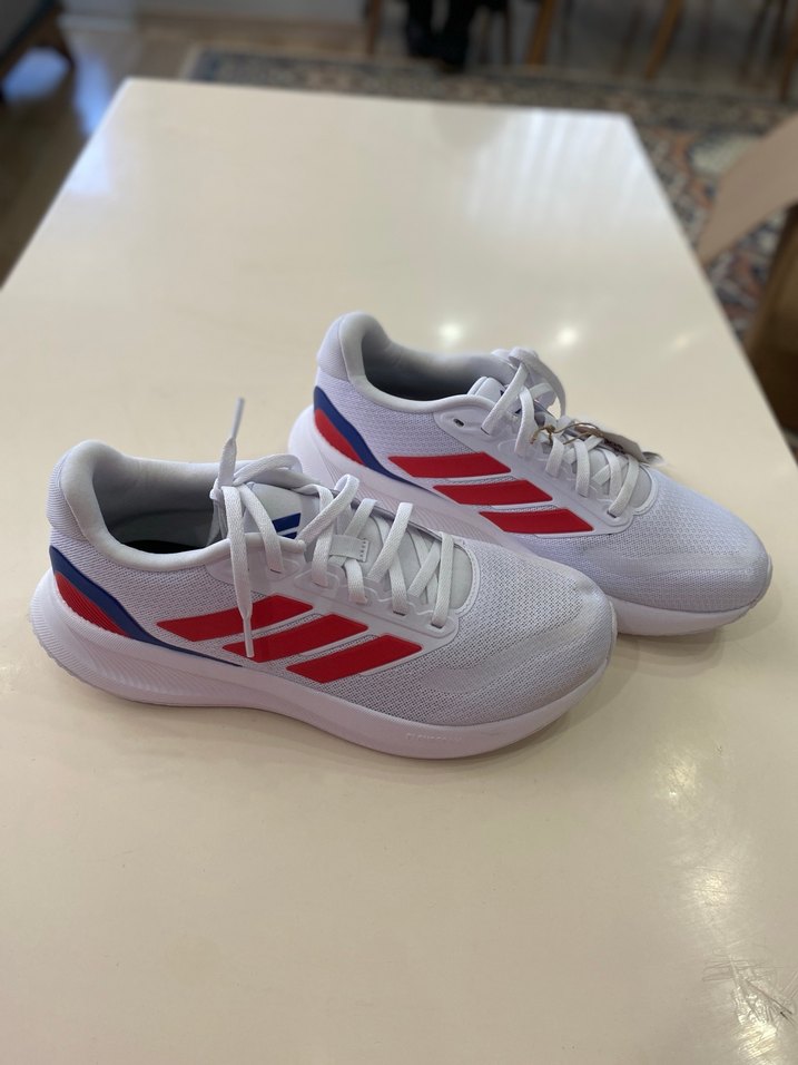 Beyaz, bağcıklı kadın spor ayakkabısı, kırmızı ve mavi detaylarla, ince topuklu ve hafif kauçuk tabanlı. Trendy casual ve spor için uygun.