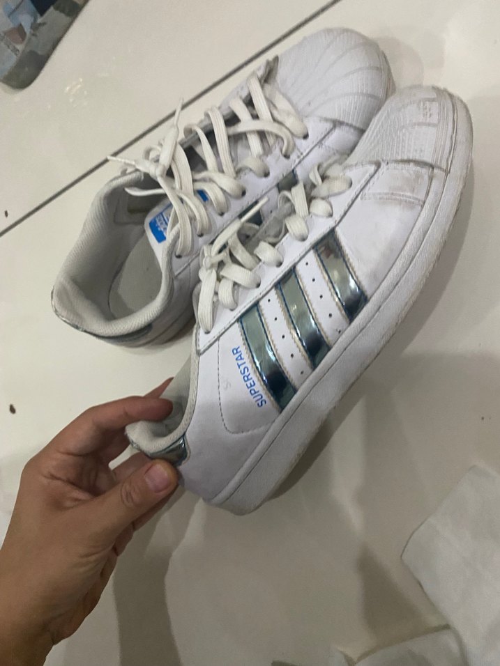 ADİDAS Beyaz, bağcıklı kadın spor ayakkabısı, düz kauçuk tabanlı ve gri metalik şerit detaylıdır. Rahat ve günlük kullanıma uygundur.