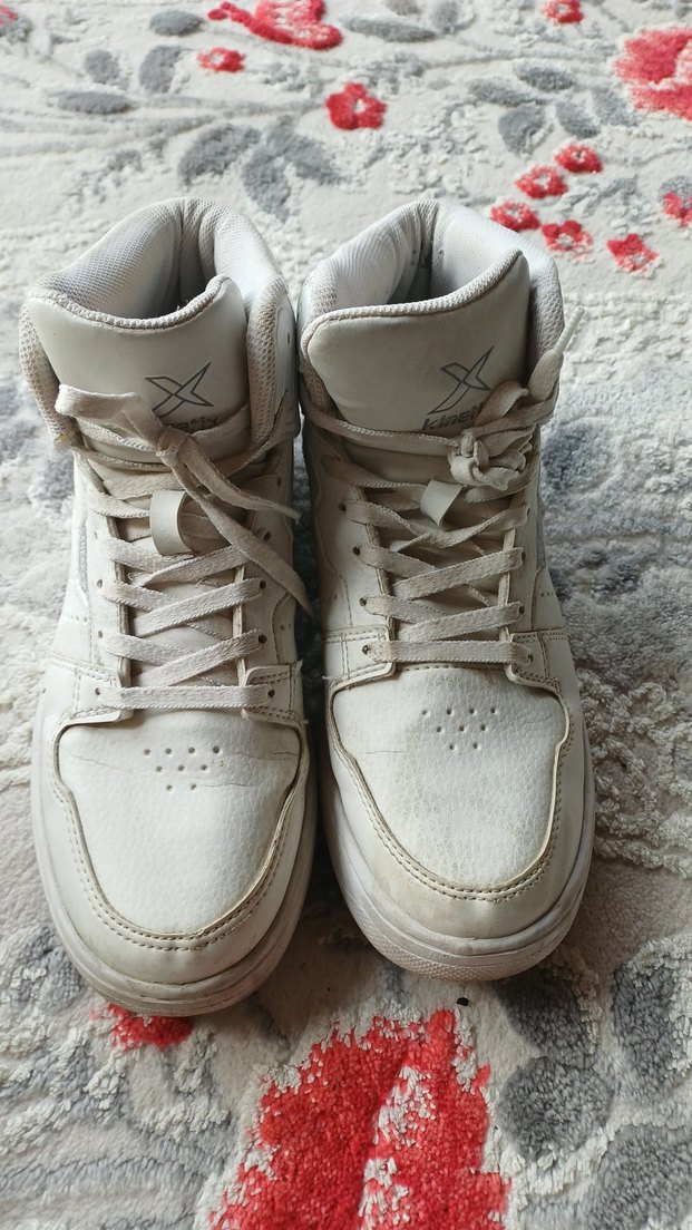 Beyaz renkte, bağcıklı ve ince topuklu kadın spor ayakkabısı. Kauçuk malzemeden yapılmıştır, spor ve sokak tarzına uygundur.