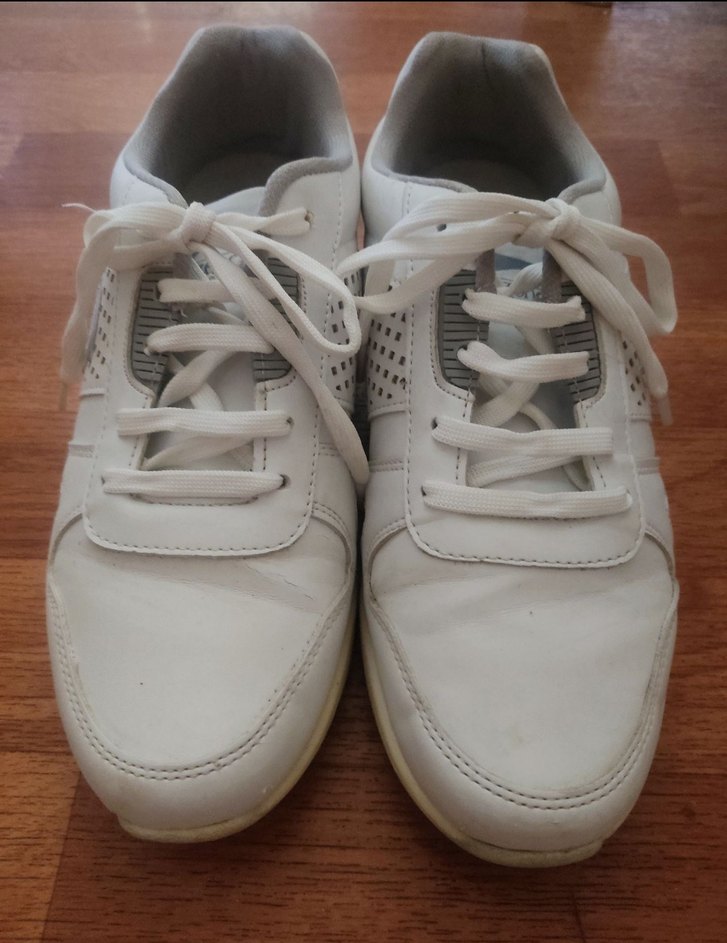 Beyaz, bağcıklı, lastik tabanlı kadın spor ayakkabısı. İnce topuklu, sade ve desensiz tasarım. Yırtık ya da sökük vb sorun yok. Sadece beklemekten taban kısmı bir miktar sararmış boyanarak halledilebilir.