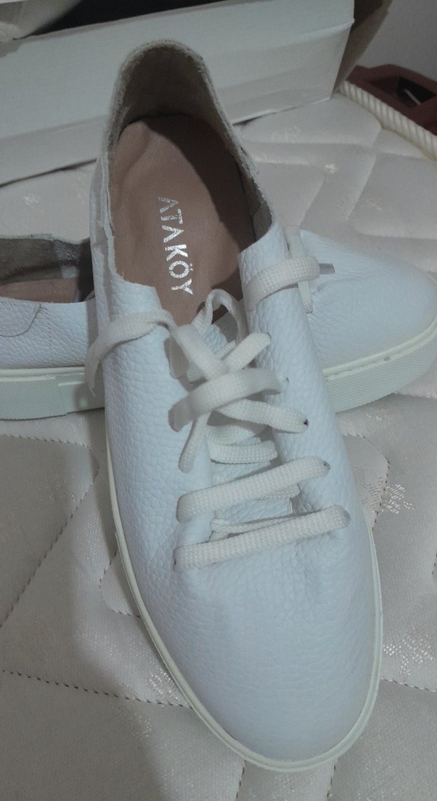 Beyaz, bağcıklı, düz tabanlı kadın spor ayakkabısı. Pastel tonlarda, desen içermeyen, günlük athleisure ve sokak stili için uygundur. İç kısmında ATAKOY markası bulunur.