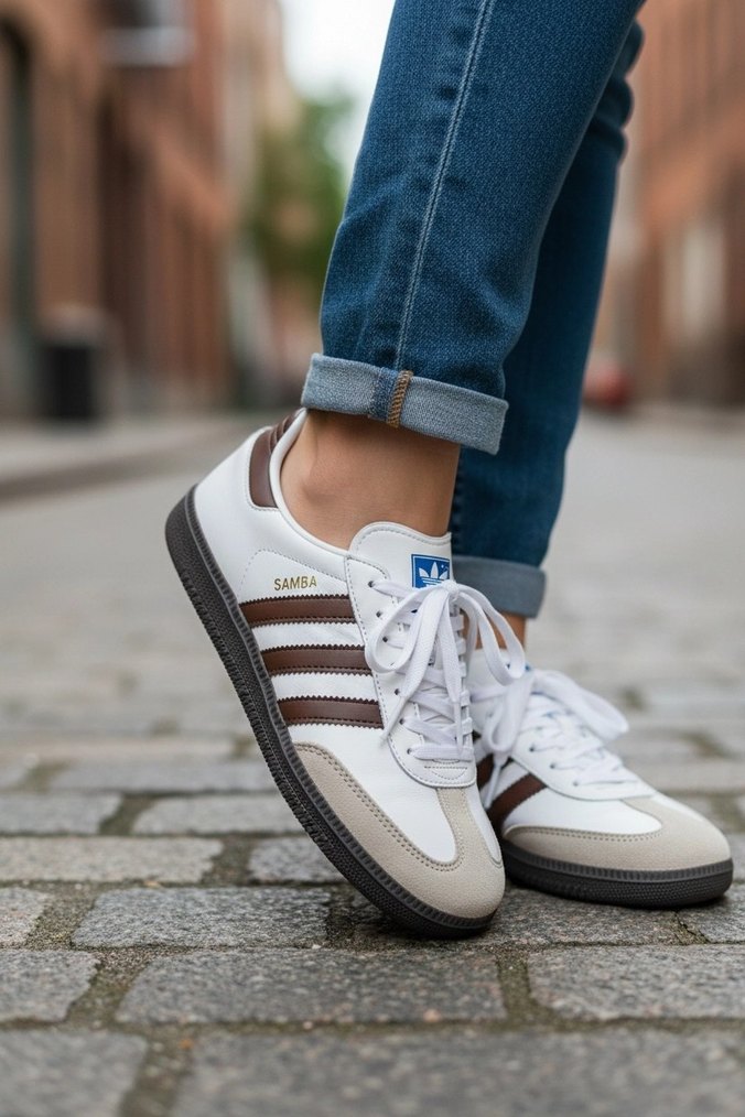 Gri ve kahverengi detaylı beyaz bağcıklı kadın spor ayakkabısı, klasik sokak stili ve stiletto topuklu. Günlük kullanıma uygun.
