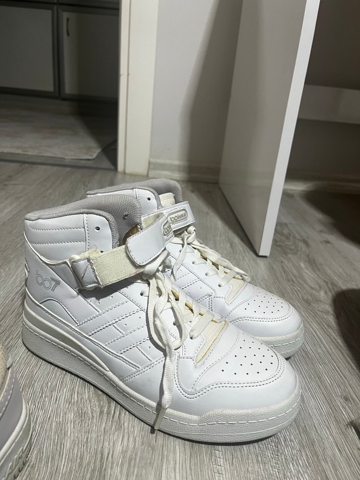 Beyaz, bağcıklı, dolgu topuklu kadın spor ayakkabısı. Kauçuk malzemeden, hafif ve desensiz tasarım, spor ve sokak giyimine uygun hiç giyilmedi