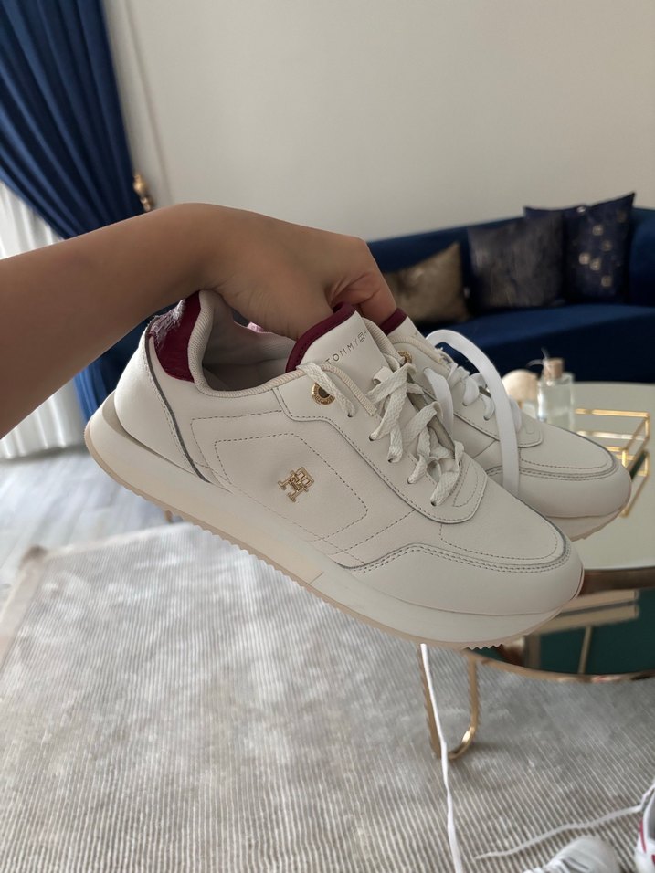 Beyaz bağcıklı kadın spor ayakkabısı, hafif kauçuk tabanlı ve stiletto topuklu, günlük kullanıma uygun şık ve sade tasarım. Orjinaldir Marmara forum Boyner mağazasından alındı