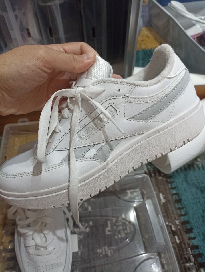 Bağcıklı beyaz kadın spor ayakkabısı, gri detaylı, ince topuklu ve lastik tabanlı, spor ve sokak stiline uygun.