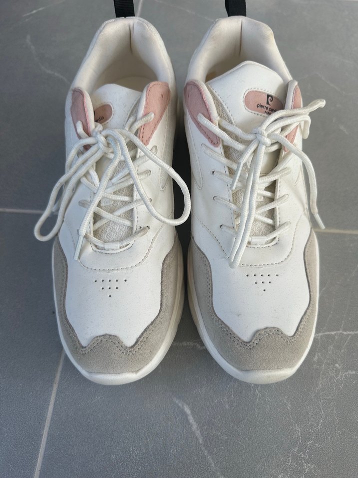 Beyaz bağcıklı kadın spor ayakkabısı, pastel detaylı ve lastik malzemeden, stilettolu topuklu, sokak stiline uygun .