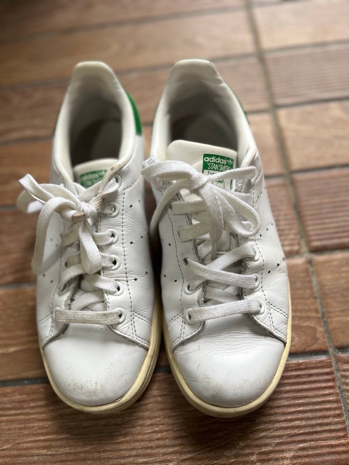 Spor ve günlük kullanıma uygun, düz tabanlı beyaz bağcıklı kadın spor ayakkabısı. Parlak yüzeye sahiptir. Yırtık, sökük yoktur.