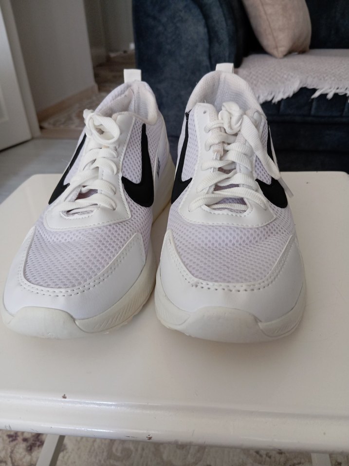 Nefes alabilen üst kısmı ve kauçuk tabanlı, bağcıklı beyaz kadın spor ayakkabısı. Spor ve günlük kullanıma uygundur.