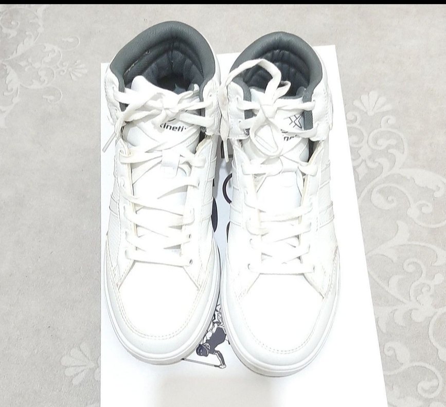 Beyaz bağcıklı stiletto topuklu 39 numara erkek spor ayakkabısı, gri detaylı ve kauçuk tabanlıdır, sokak stili ve spor şıklığını bir arada sunar.