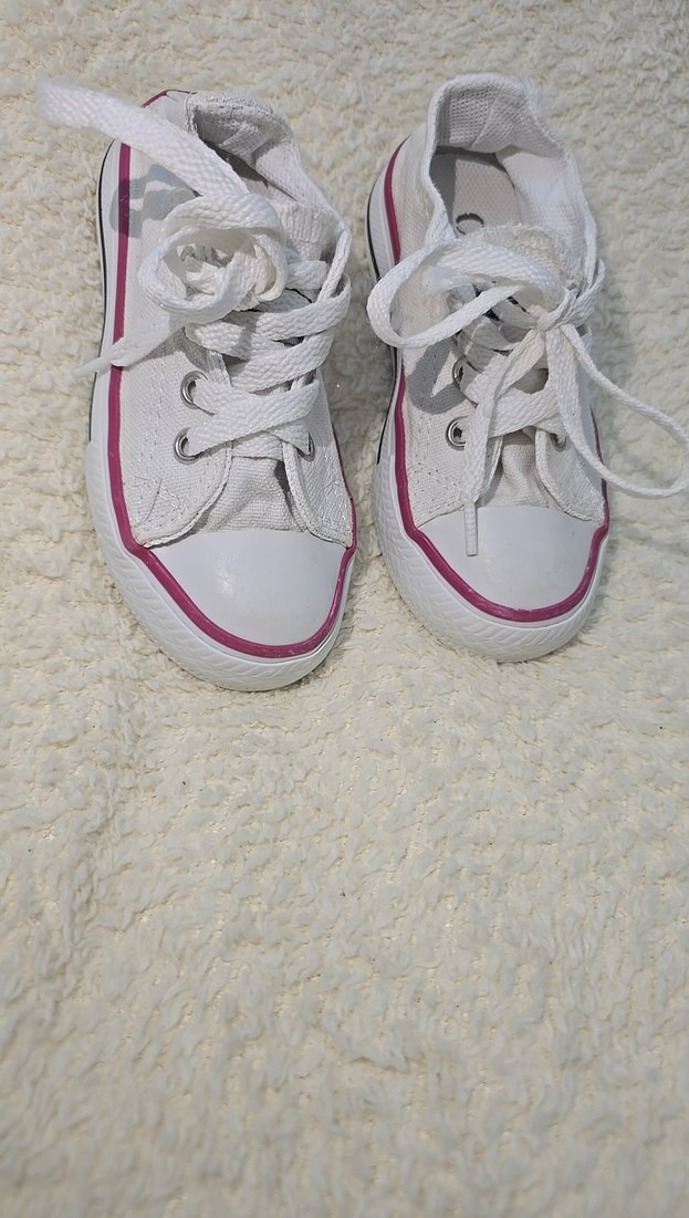 Beyaz renkli, bağcıklı, pembe çizgili detaylı kız çocuk spor ayakkabısı. Kauçuk malzemeden, sade ve renkli tarzda.