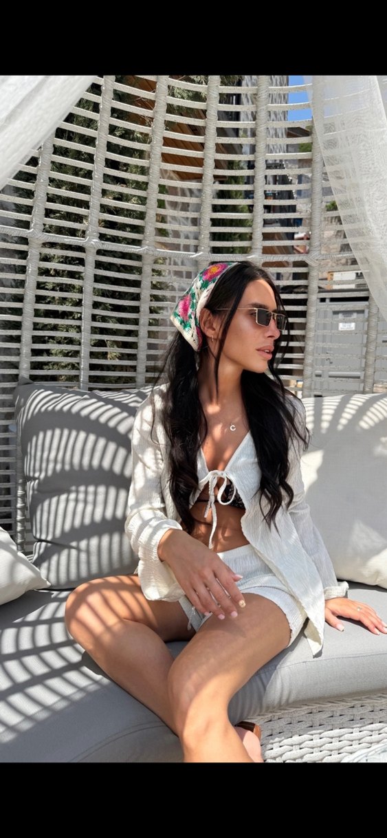 Bağcıklı, bol kesim ve ince askılı beyaz kadın monokini, hafif batik desenli, dış mekan kullanımı için uygun.
