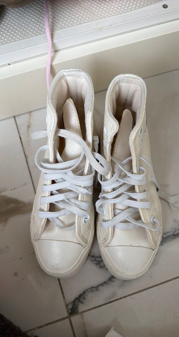 Beyaz bağcıklı, minimalist tasarımlı spor ayakkabı. Kauçuk tabanlı ve ince topuklu, trend sokak stili için uygundur.