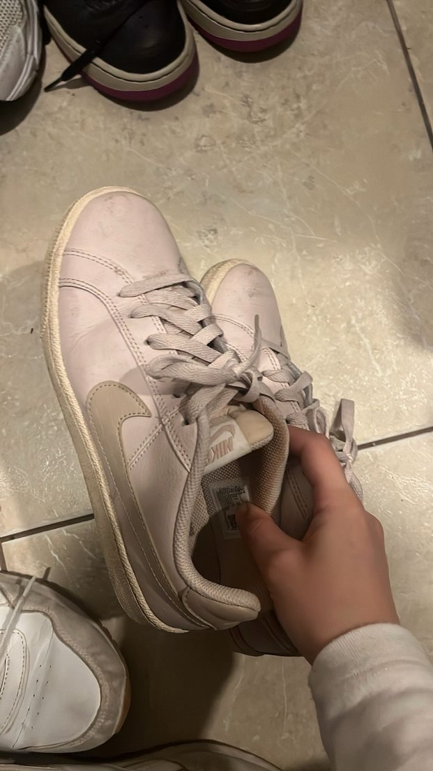 Beyaz bağcıklı Nike kadın spor ayakkabısı, kauçuk tabanlı ve pastel tonlarda. Trendy casual sokak stiline uygun, günlük kullanıma elverişli.