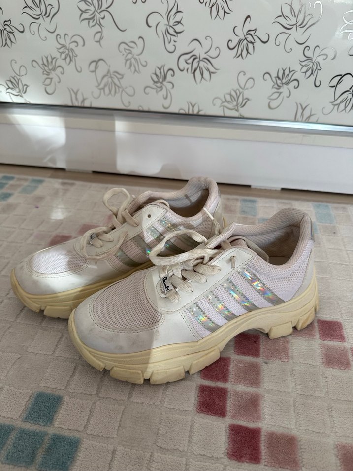 Bağcıklı, beyaz platform spor ayakkabı, lastik tabanlı ve bağcıklı, bağcıklı bağcık detayıyla günlük kullanım için uygundur. Bambi marka çok rahattır . Fiyatta pazarlık payı vardır . Toplu alımda indirim de vardır . Ayakkabı sadece kirlidir başka bir kusuru yoktur.