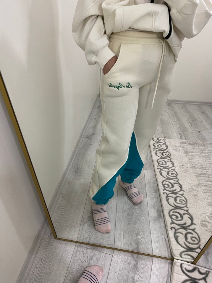 Yumuşak ve sıcak kumaştan, üç iplik şardonlu sıcacık tutuyor, bağcıklı bel ve pastel baskılı detaylara sahip, rahat kesim beyaz kadın eşofman. Günlük kullanım için uygundur.