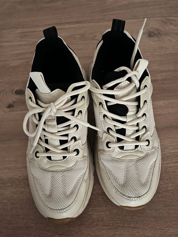 Beyaz bağcıklı, ince topuklu ve kauçuk tabanlı kadın spor ayakkabısı. Trendy günlük sokak stili için uygundur, desensiz ve gri tonlardadır.