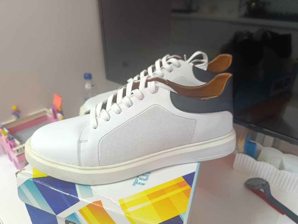 beyaz detaylara ve bağcıklı tasarıma sahip beyaz spor ayakkabılar, kauçuk tabanlıdır ve streetwear stiline uygundur.