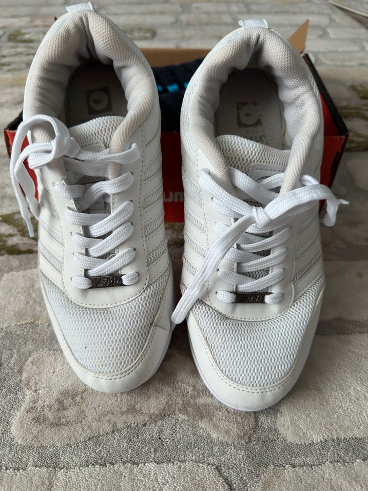 Beyaz bağcıklı spor ayakkabısı, kauçuk tabanlıdır. Spor ve sokak giyimine uygundur, sade ve basic stilde stiletto topukludur.
