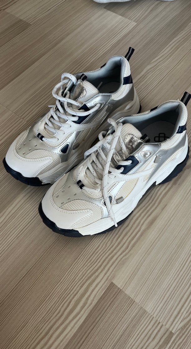 Sıfır hiç kullanılmadı .Beyaz ve gri renklerde, platform topuklu ve bağcıklı kadın spor ayakkabısı, kauçuk tabanlıdır. Spor ve sokak stili için uygundur.