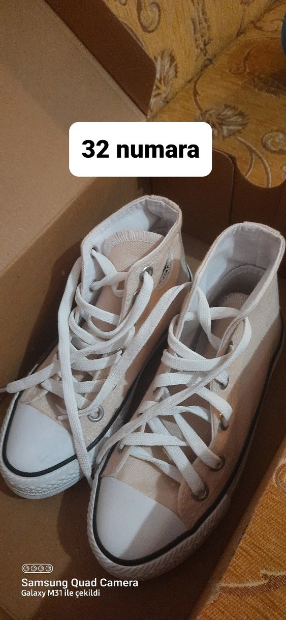 Beyaz bağcıklı, spor ayakkabısı. Günlük sokak stiline uygun, rahat kauçuk tabanlı. 32 numara.