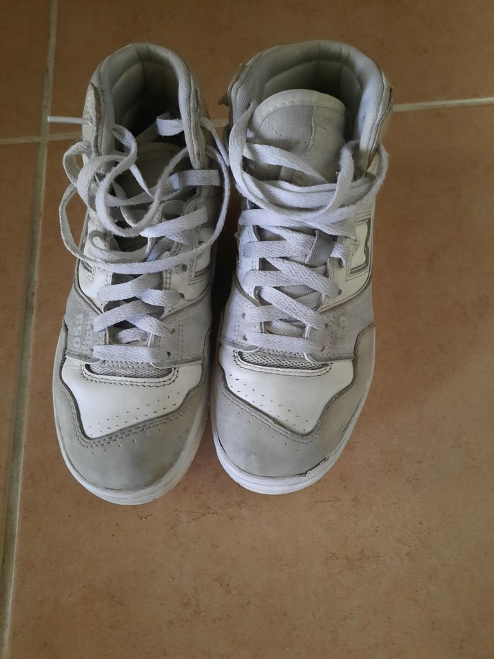 Gri ve beyaz renklerde, bağcıklı, dolgu topuklu spor ayakkabısı. Kauçuk tabanlı, spor ve sokak stili için uygun. sol burunda deri deforme olmuştur, 38.5 numara