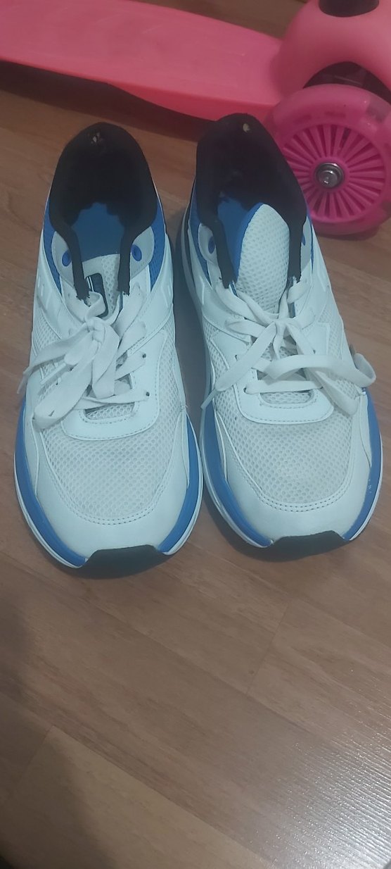 Beyaz, bağcıklı spor ayakkabısı. Kauçuk malzemeden üretilmiş, desen içermeyen ve sokak stiline uygun.