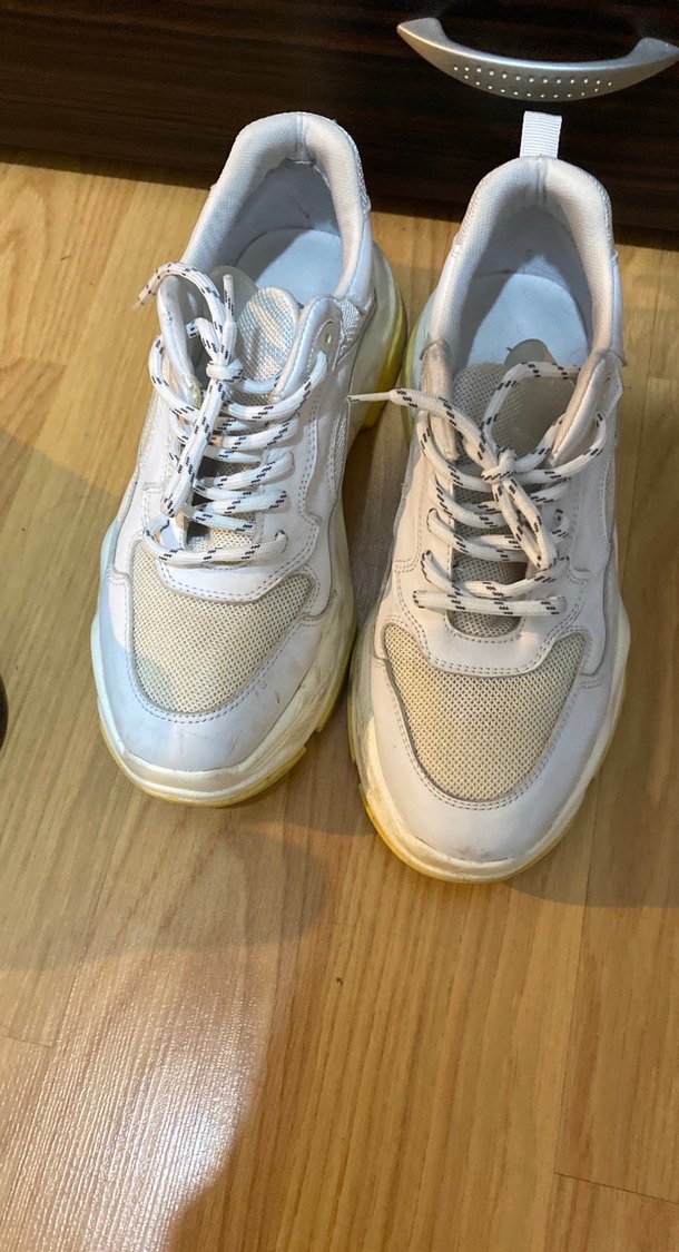 Beyaz, bağcıklı ve kauçuk tabanlı kadın spor ayakkabıları, sportif sokak stili ve trend casual görünüm için uygun.hediye geldi bi kaç defa giyildi ama büyük geldi.