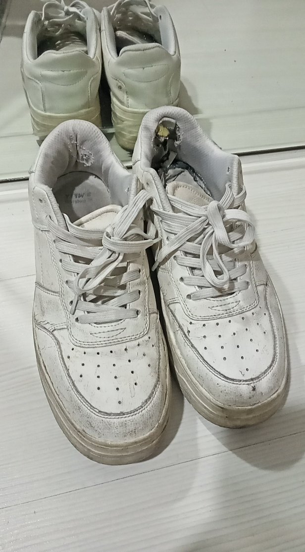 Beyaz, bağcıklı ve lastik tabanlı kadın spor ayakkabıları. İnce topuklu stiletto tarzında, spor ve trend görünüme uygun. Kullanım izleri var.