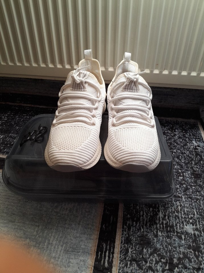Beyaz bağcıklı, lastik tabanlı stiletto topuklu spor sneakers, trend sokak stili için uygun. Spor aktiviteleri için ideal.