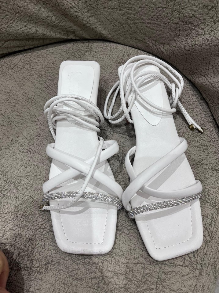 Beyaz bağcıklı stiletto topuklu sandaletler, minimalist bohem tarzıyla dikkat çekiyor. Lastik malzemeden üretilmiş, günlük kullanım için uygundur.
