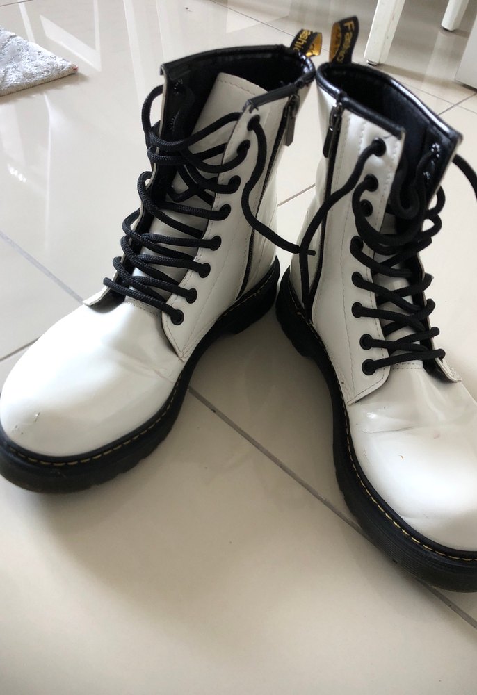 Beyaz, bağcıklı ve lastik malzemeden yapılmış kadın botları. Stiletto topuklu, düz yüzeyli ve siyah bağcıklarıyla grunge punk tarzı için uygundur.