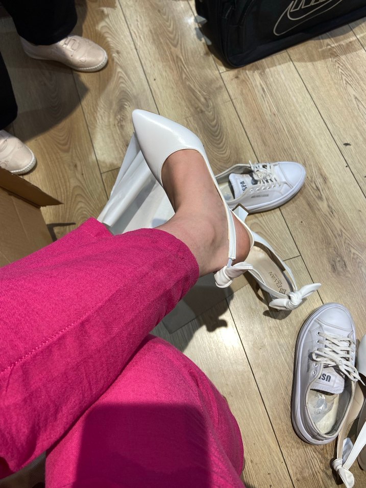 Sentetik kumaştan yapılmış, bağcıklı detaylı beyaz kadın ayakkabısı. İnce stiletto topuklu, gündelik ve normcore tarzda uygun.